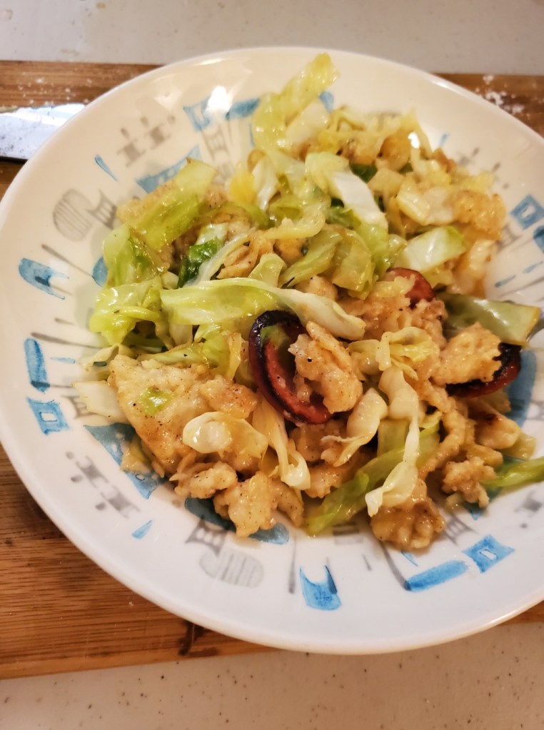 Add sliced cabbage to kielbasa grease and cook until starting to wilt but still al dente. Remove and set aside with kielbasa.