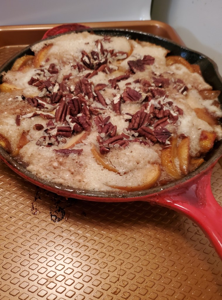 When the peaches and liquid are syrupy, pour the batter on top of the peaches to have an even coating over the top. Place in the preheated oven for 15-20 minutes or when the batter is no longer jiggly when you shake the pan a little. Remove from oven and let rest for 5 minutes before serving with ice cream.