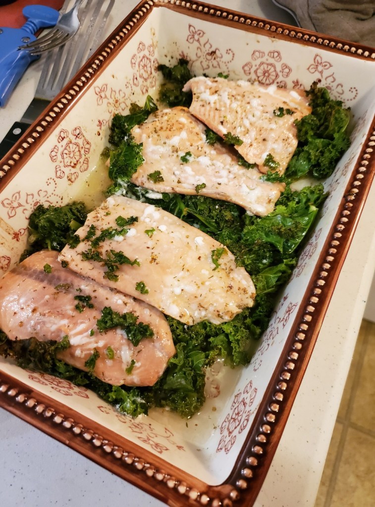 In a glass casserole pan, place kale on the bottom of the pan. Season the salmon with salt and pepper and nest the salmon in the kale. Whisk together the olive oil, lemon juice, dill, and parsley and drizzle over the salmon and kale. Let sit for at least 15 minutes.